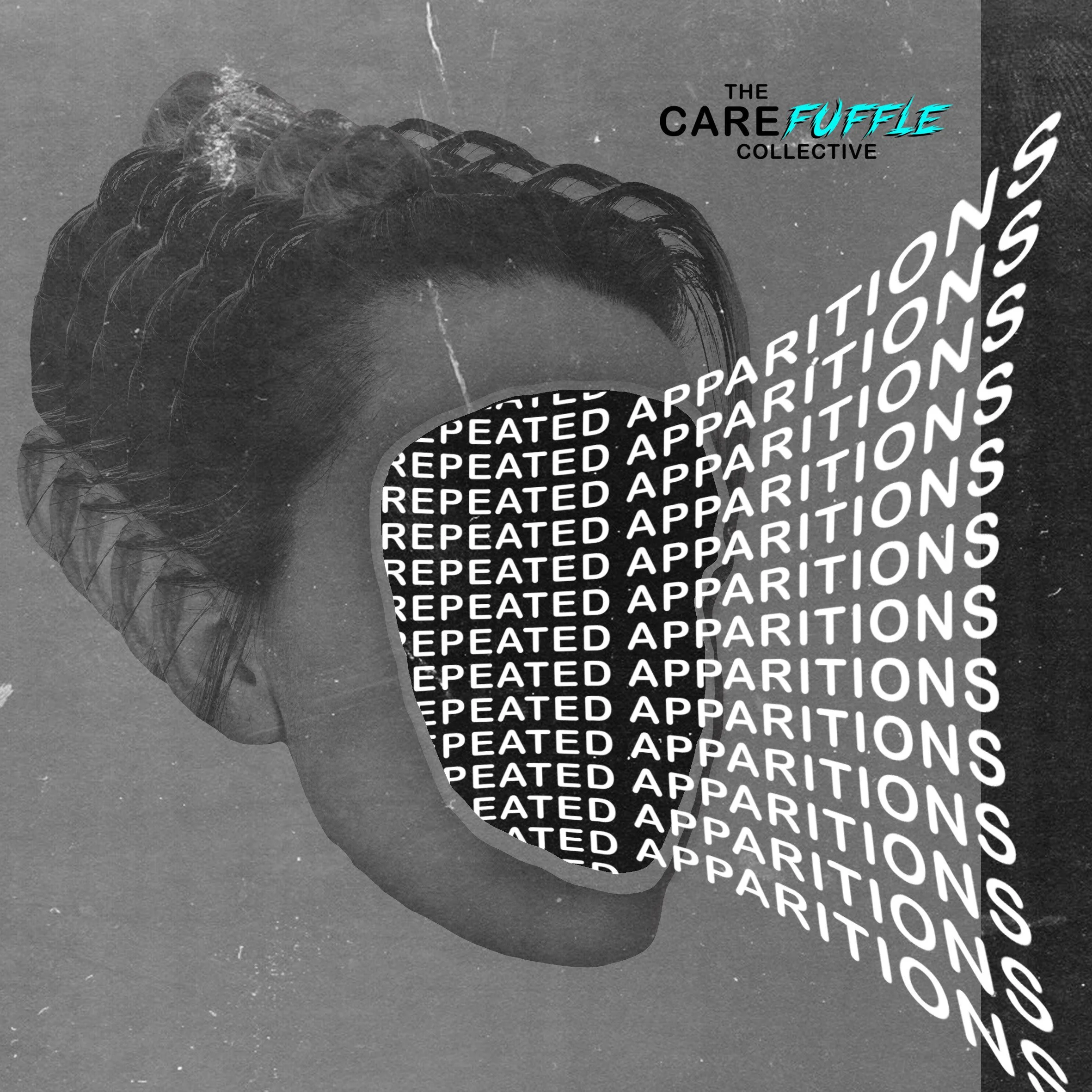 Image Description: A collage of a face is overlapped several times, out of the front of the face the words ‘Repeated Apparitions’ stream in layers in curved line, as if a slip snake’s tongue. In the top right-hand corner the words ‘The Carefuffle Collective’ are written in a mixture of fonts with a dash of blue.